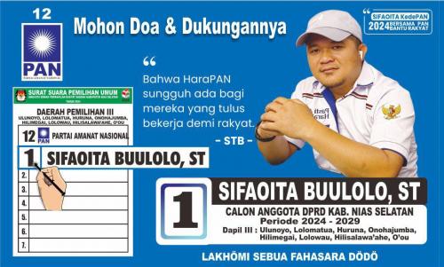 Sabtu, 02-09-2023 - 13:15:57 WIB METROMANDIRI.COM NIAS - Lesman Buulolo Caleg Dprd kabupaten Nias Selatan.Dari Ujung Selatan Yang Terlahir Sederhana, Pembawa Perubahan Yang Mensejahterahkan Rakyat*Pemuda adalah agent of change.Panutan kami, Senator kami para Anak muda dari ujung Selatan. Harapan kami doa kami, dukungan kami, serta suara Kami, Hati Rakyat adalah Untuk...(read more)