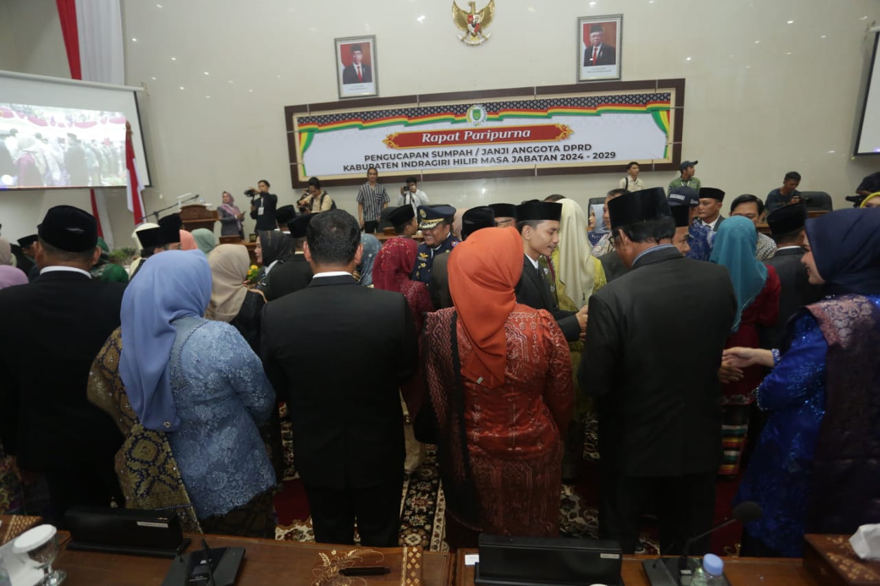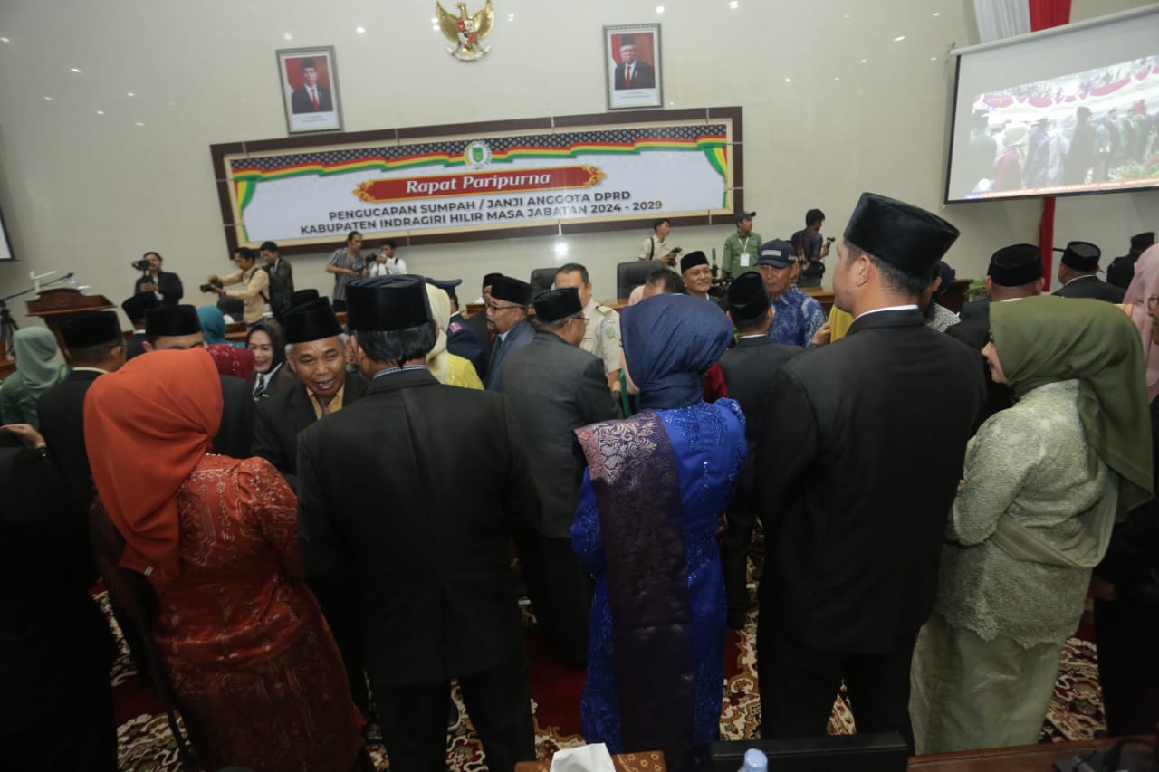 TEMBILAHAN - Sebanyak 45 Anggota Dewan Perwakilan Rakyat Daerah (DPRD) Kabupaten Indragiri Hilir (Inhil) diambil sumpah dan janjinya dihadapan masyarakat untuk menjadi Anggota Dewan terpilih masa bakti 2024-2029 di gedung Paripurna DPRD Inhil Jalan Soebrantas, Senin (17/9) Pagi.
