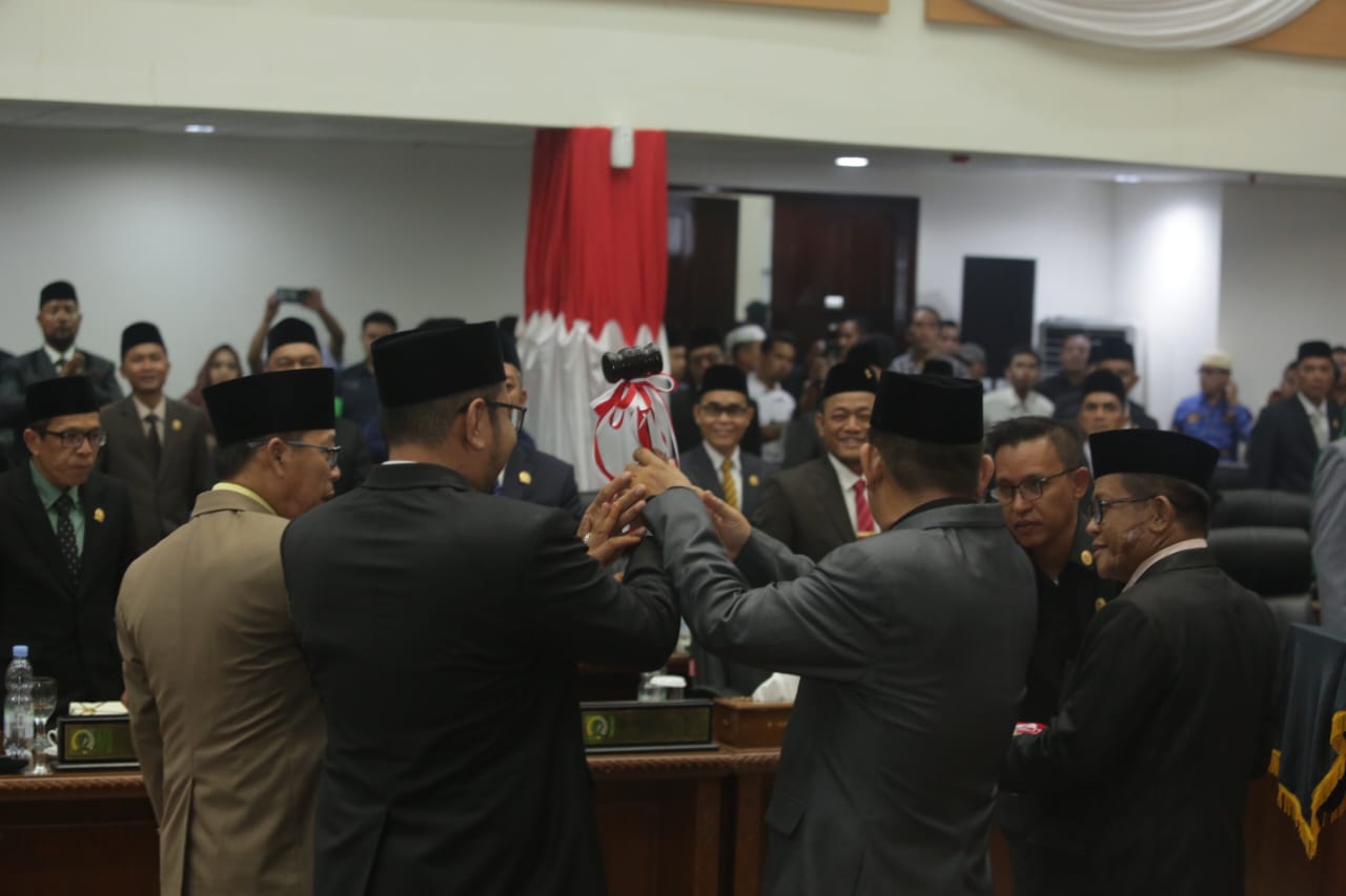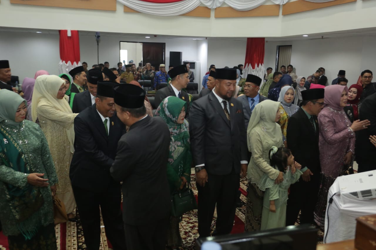 Dalam kata sambutannya Sekretaris DPRD Inhil Indra Yevi Rais yang membacakan surat Gubernur Riau keputusan Gubernur Riau nomor 72 KPTS 3419/8 romawi/2024 tentang peresmian pemberhentian anggota Dewan Perwakilan Rakyat daerah Kabupaten Indragiri Hilir masa jabatan tahun 2019-2024 dan peresmian pengangkatan anggota Dewan Perwakilan Daerah Kabupaten Indragiri Hilir masa jabatan 2024-2029 gubernur Riau menimbang dan seterusnya mengingat dan seterusnya memutuskan menetapkan ke-1 meresmikan pemberhentian Dengan hormat nama-nama yang tercantum dalam lampiran satu keputusan Gubernur ini sebagai anggota Dewan Perwakilan Rakyat daerah Kabupaten Indragiri Hilir masa jabatan tahun 2019-2024 disertai ucapan terima kasih atas pengabdian dan jasa-jasanya selama menjadi anggota DPRD Inhil.