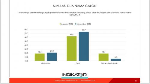 Sabtu, 23-11-2024 - 22:25:29 WIB METRO MANDIRI. COM PELALAWAN - Lembaga survei Indikator mengeluarkan survei elektabilitas jelang Pilkada Pelalawan 2024 dengan hasil paslon Zukri Tamrin menggungguli Pasangan Nazaruddin Abu Bakar, dengan selisih yang sangat signifikan antara lain, Zukri Tamrin 73%, Nazaruddin Abu Bakar 21,9%.Berdasarkan keterangan yang dirilis oleh ...(read more)