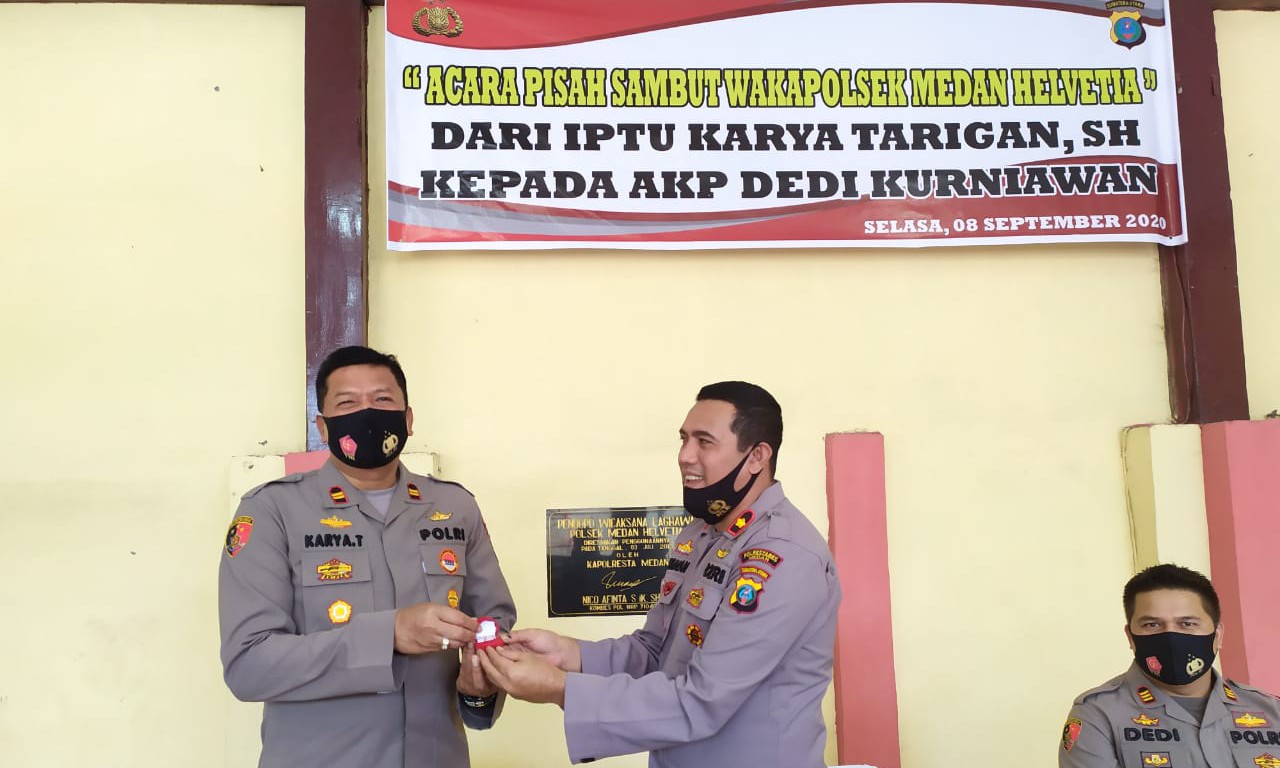 Metromandri, Medan - Polsek Medan Helvetia gelar acara pisah sambut Wakapolsek Medan Helvetia dari Iptu Karya Tarigan SH. kepada Akp Dedi Kurniawan SH yang dilaksanakan di aula Wicaksana Laghawa Polsek Medan Helvetia.Selasa (08/09/2020) pagi.