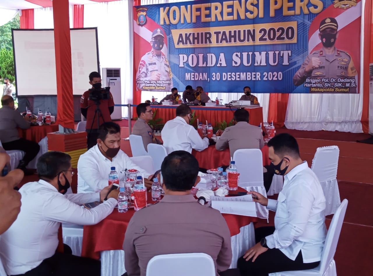Metro mandiri,Medan - Kapolda Sumatera Utara Irjen Pol Drs Martuani Sormin M.Si didampingi Wakapolda Brigjen Pol. Dr. Dadang Hartanto, SH, SIK, M.Si, Kabid Humas Kombes Tatan Dirsan dan Pejabat Utama Poldasu mengadakan konferensi pers guna menyampaikan pencapaian Polda Sumatera Utara selama 2020 di Mako Brimob Sumut Jalan Wahid Hasyim, Medan, Rabu (30/12/2020).