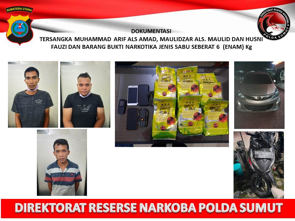 Dalam penangkapan tersebut ditemukan dan disita barang bukti berupa 6 bungkus plastik teh warna hijau bertuliskan tulisan cina merek Guanyinwang, didalamnya berisikan Narkotika jenis Sabu dengan berat keseluruhan seberat 6 Kg yang dibalut dengan plastik warna hitam yang disimpan didalam dashboard 1 satu unit mobil merek Toyota Avanza warna silver dengan No. Pol B-1099-URR.