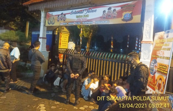 Dari lokasi, Katim Rajawali Dit Samapta Polda Sumut Briptu Rezky Syaputra didampingi Aipda DM Karosekali, mengamankan 23 pemuda yang terlibat aksi saling serang.