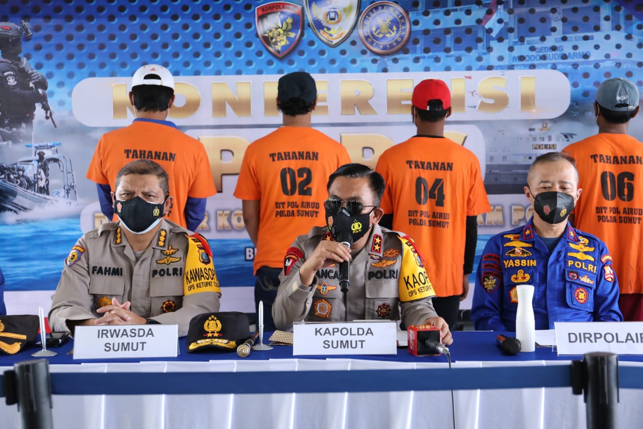 ETROMANDIRI.COM MEDAN - Kapolda Sumut Irjen Pol RZ Panca Putra Simanjuntak bersama Dirpolair Korpolairud Baharkam Polri Brigjen Pol Yassin Kosasih, memimpin press rilis penangkapan kapal ikan asing di Selat Malaka.