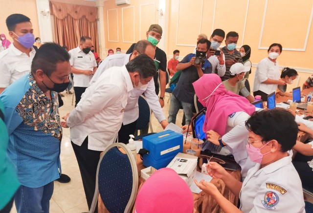 METROMANDIRI.COM - TANJUNG MORAWA - Hari ke-2 program vaksin massal 10.000 orang tahap pertama , Wakil Bupati Deli Serdang H.M Ali Yusuf Siregar meninjau pelaksanaan vaksinasi di Tanjung Morawa. Kegiatan tersebut dipusatkan di Kito Convention Hall, Jalan Dahlan Tanjung, Desa Tanjung Morawa A, Kecamatan Tanjung Morawa, Deli Serdang, Sumatera Utara, Rabu (9/6/2021) siang. Didampingi Kadis Kesehatan dr. Ade Budi Krista, Camat Tanjung Morawa Marianto Irawadi beserta Muspika, Tokoh Masyarakat dan FKDM Tanjung Morawa.
