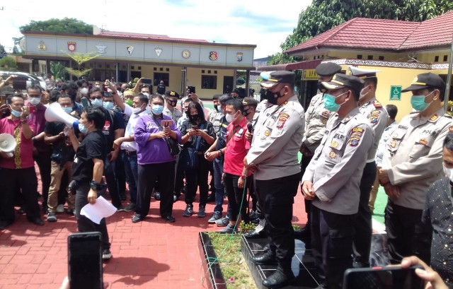 METROMANDIRI.COM SIMALUNGUN - Ratusan Wartawan/Jurnalis dari sejumlah media TV, Cetak dan online melakukan aksi damai dan orasi di Mapolres Simalungun Pematang Raya Kab Simalungun, Senin (21/06/2021).
