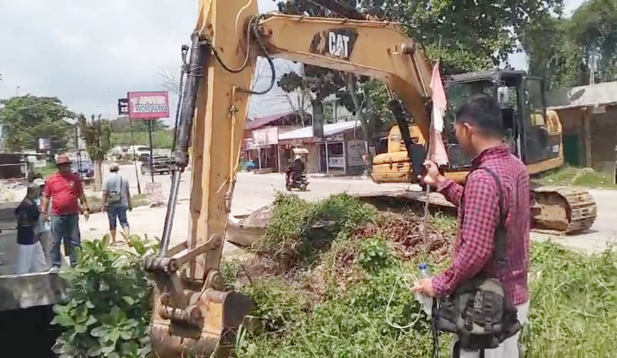 METROMANDIRI.COM PELALAWAN - Camat Pangkalan Kerinci Junaidi SPd MSi dengan dibantu alat dinas terkait membersihkan parit di Kelurahan Pangkalan Kerinci Timur, Kamis (9/1/2025).