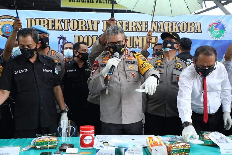 Kapolda Sumut pimpin press release pengungkapan kasus narkotika jaringan Malaysia - Indonesia oleh DitResNarkoba Polda Sumut seberat 8,3 kg,1 TSK Diberi Tindakan Tegas Dan Terukur.