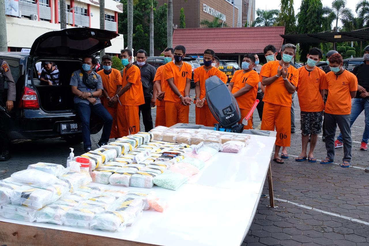 Metro mandiri,Pekanbaru - “Hanya dalam kurun waktu 9 hari saja (28 Nopember hingga 6 Desember 2020), Direktorat Narkoba Polda Riau, Polresta Pekanbaru dan Polres Bengkalis berhasil menggulung sindikat narkoba diempat lokasi berbeda dengan membekuk 11 orang pelaku dan 2 orang dinyatakan DPO”, terang Kapolda Riau Irjen Agung Setia Imam Effendi mengawali konferensi persnya tentang pengungkapan narkoba pada Selasa siang (8/12).
