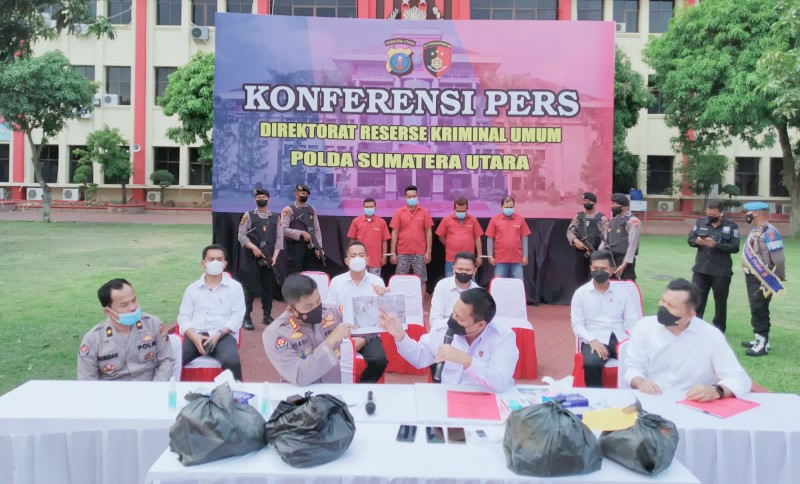Direktur Reskrimum Polda Sumut, Kombes Pol Tatan Dirsan Atmaja didampingi Kabid Humas, Kombes Pol Hadi Wahyudi perlihatkan barang bukti, Senin (14/3/2022)
