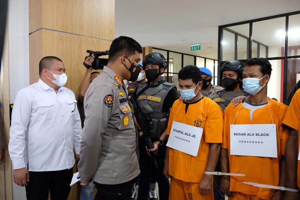 Tiga tersangka berinisial Df, Sg dan Sy hanya bisa tertunduk saat dihadirkan dalam jumpa pers yang digelar di Mapolda Riau, pada Rabu (13/4/2022) siang.